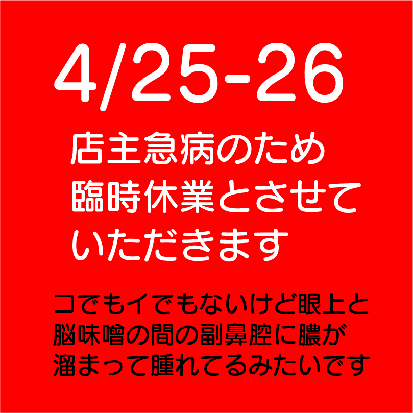 体調不良にともないまして4/25-26を臨時休業とさせていただきます2025年4月25日業務日誌業務日誌 楽しみにしていただいていたみなさまにはまことに申し訳なく、体の弱さが情けない限りでございます。 明日土曜、再度検査を受けて流行病でなく、体調も戻っておりましたら通常営業の予定です。 なお、27日日曜日は16時ごろよりスト3 3rdの初心者対戦会(足長おじさんより3クレ無料会)が 開催予定です。これまでにはなんとか体調を戻そうと思います。 営業再開時には改めましてよろしくお願いいたします。 業務日誌業務日誌